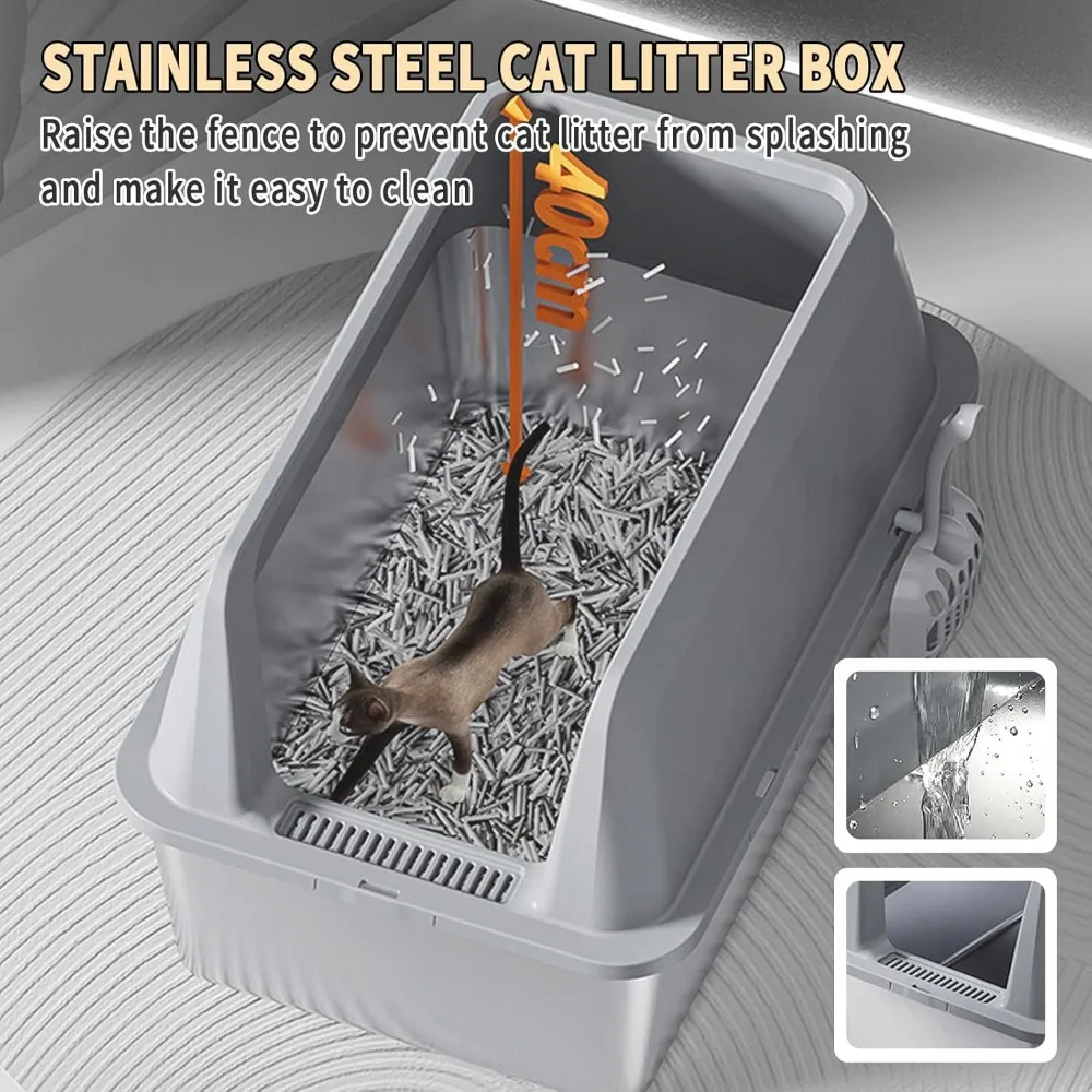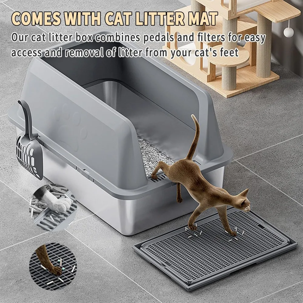 Large Stainless Steel Cat Litter Box with High Sides and Litter Mat for Easy Cleanup and Odor Control