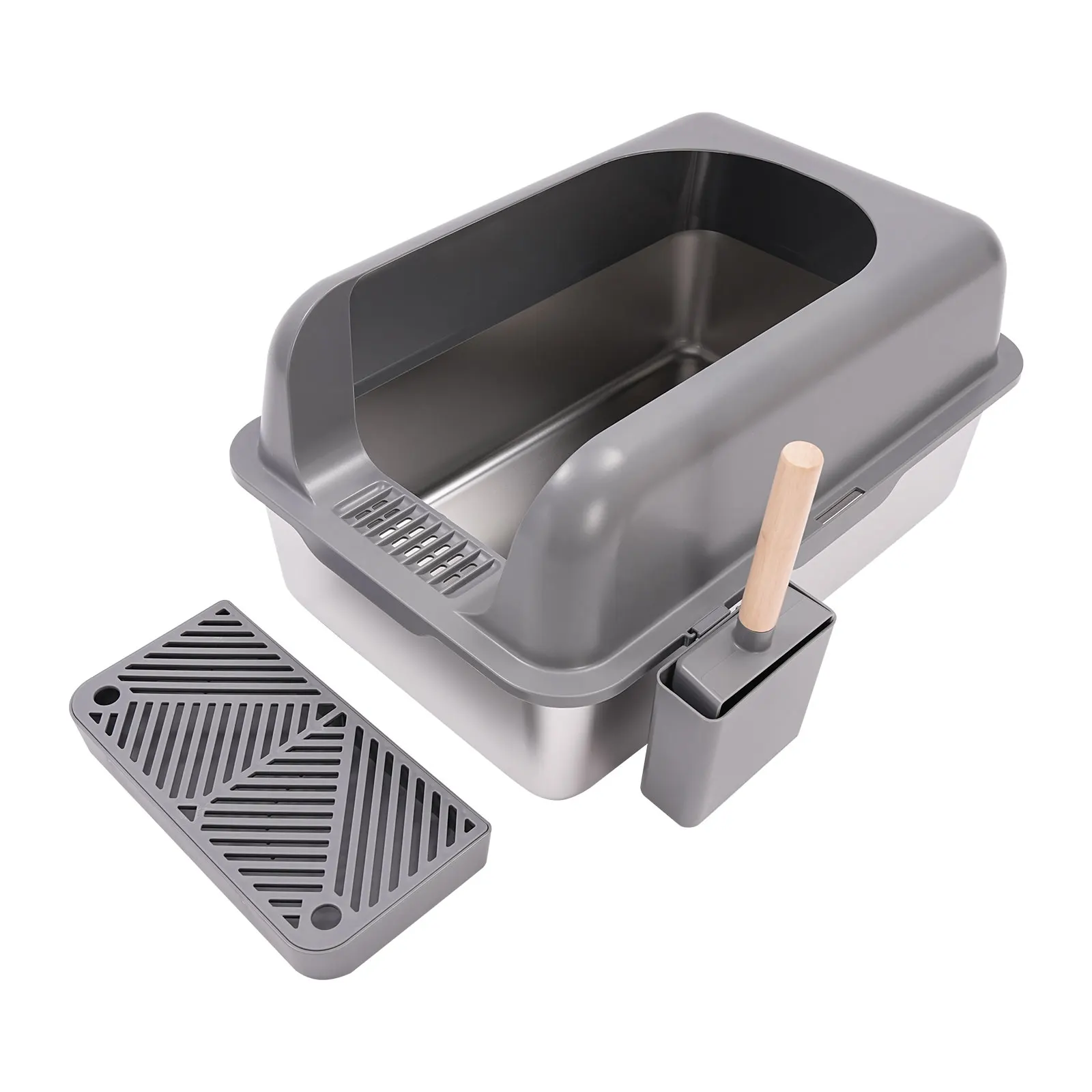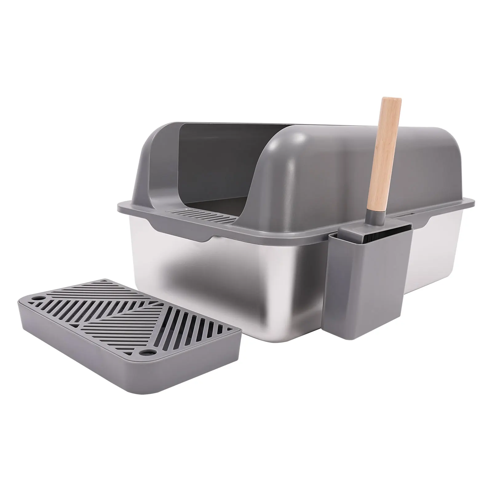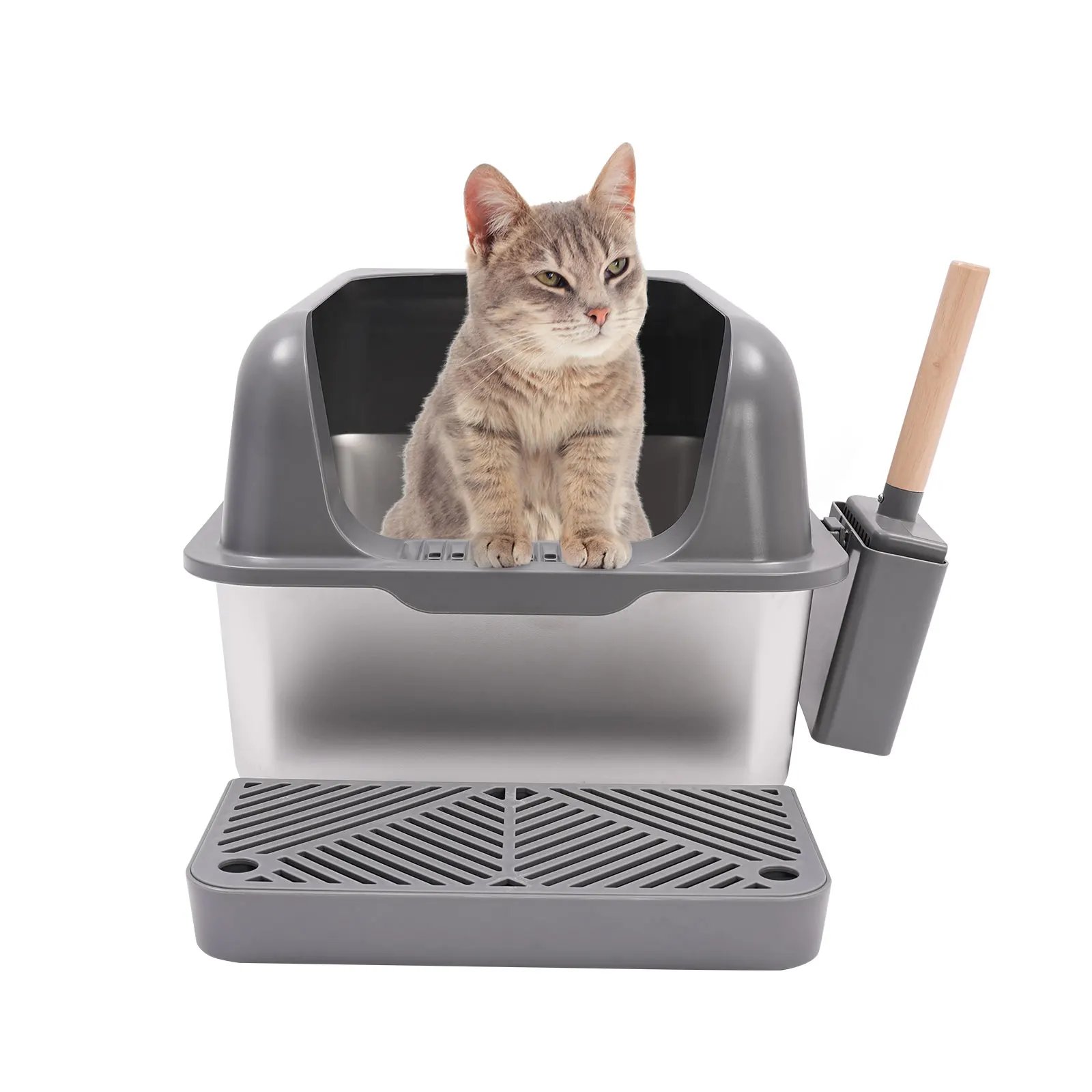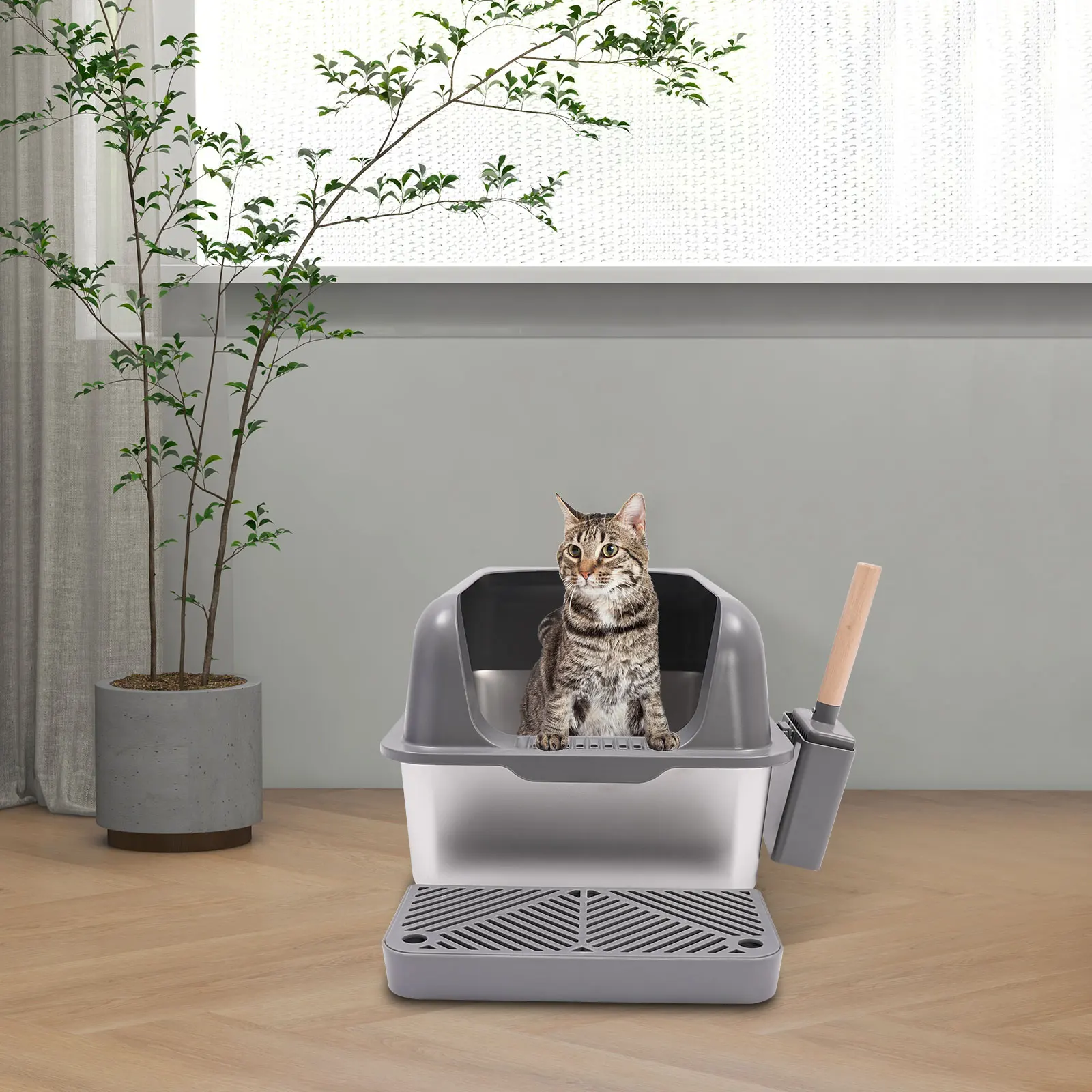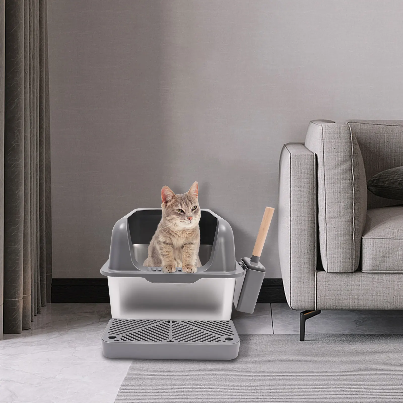 Stainless Steel Cat Litter Box with Protective Shovel Placed in Living Room, Hallway, Bedroom, Pet Store