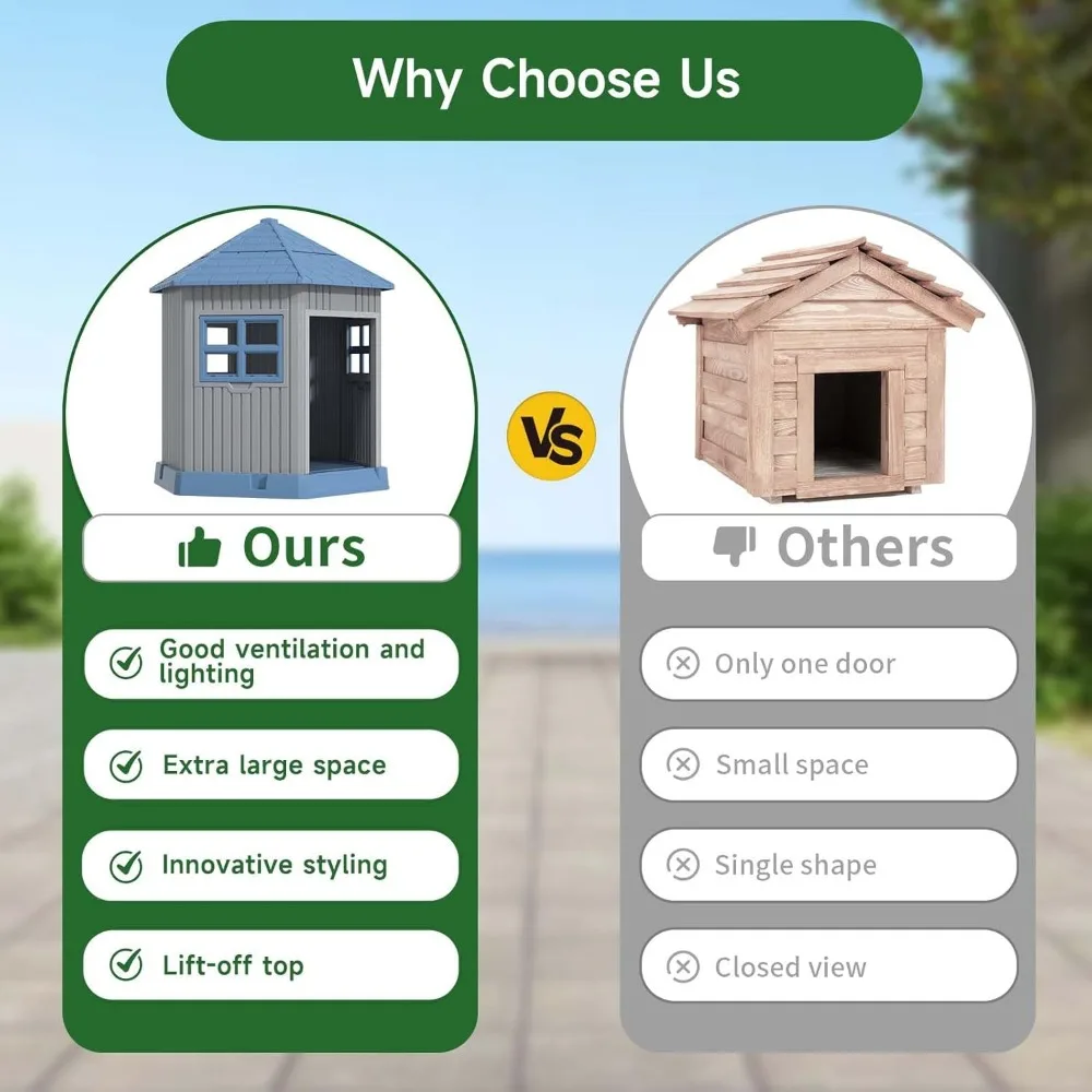 • VENTILATED AND THERMOSTATIC DOGHOUSE: The outdoor dog house roof top and window ventilation system helps fresh air circulation, and the innovative heat balance feature protects your pet in cold weather and keeps it cool in hot environment.