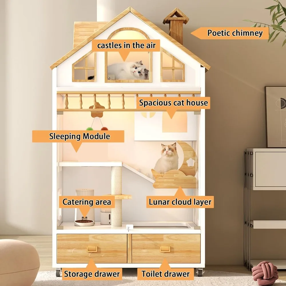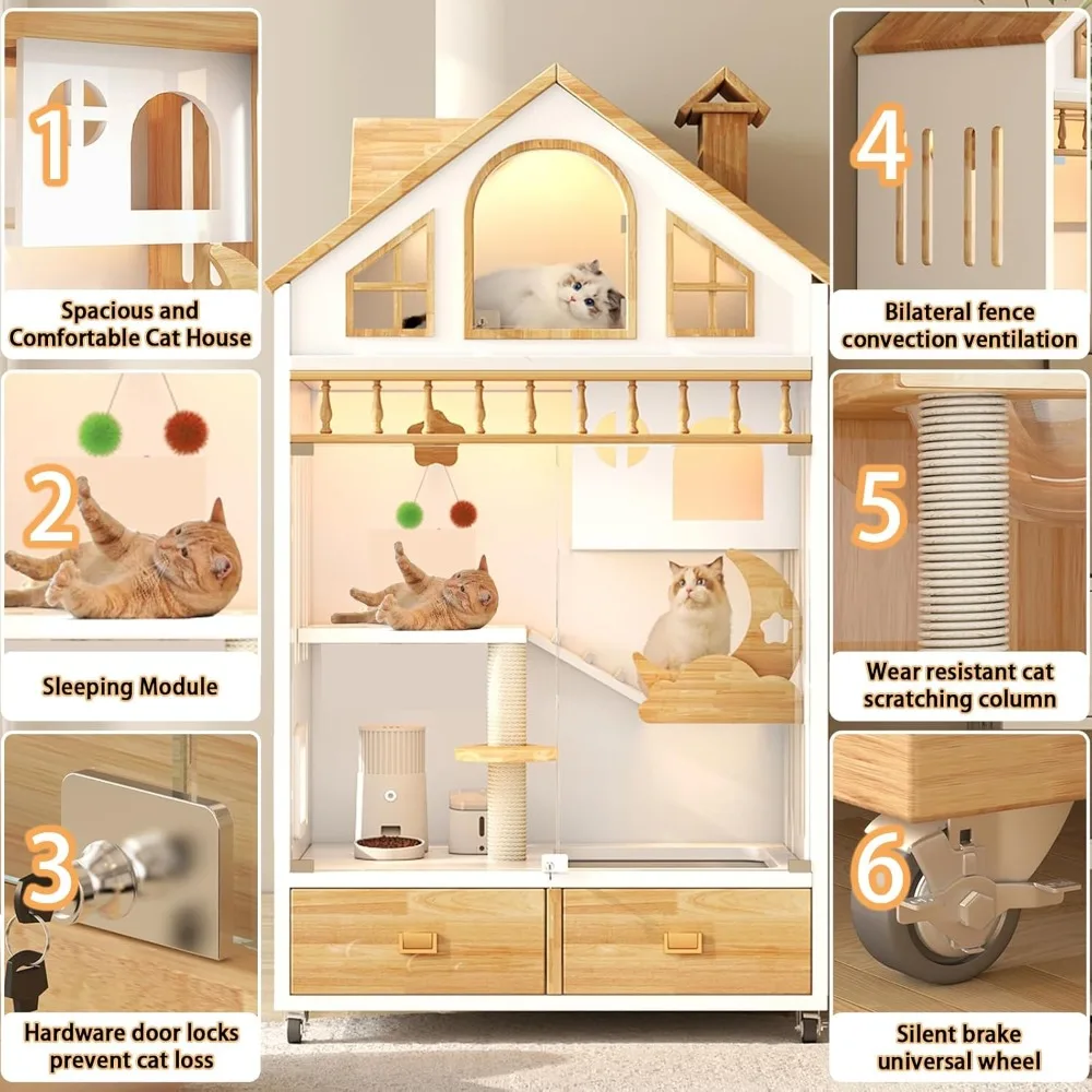 • 【Glass Visible Door & Super Accessories】The door of the cat apartment is made of glass material, which has high clarity and transparency, allowing you to observe the cat; Equipped with 3 LED lights to make it easy to observe the cat's movements at night, while we also provide fun cat sticks and cat pads to keep your pet entertained.