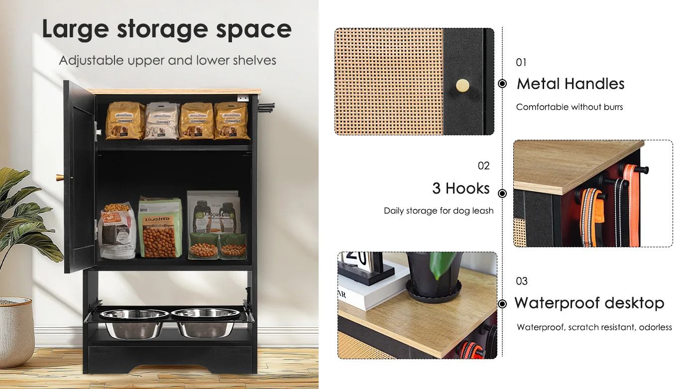 Feeding Station with 1 Storage Cabinets, Pet Feeding Station with 2 Elevated Dog Bowls, Side Hooks, Anti-tip Kit