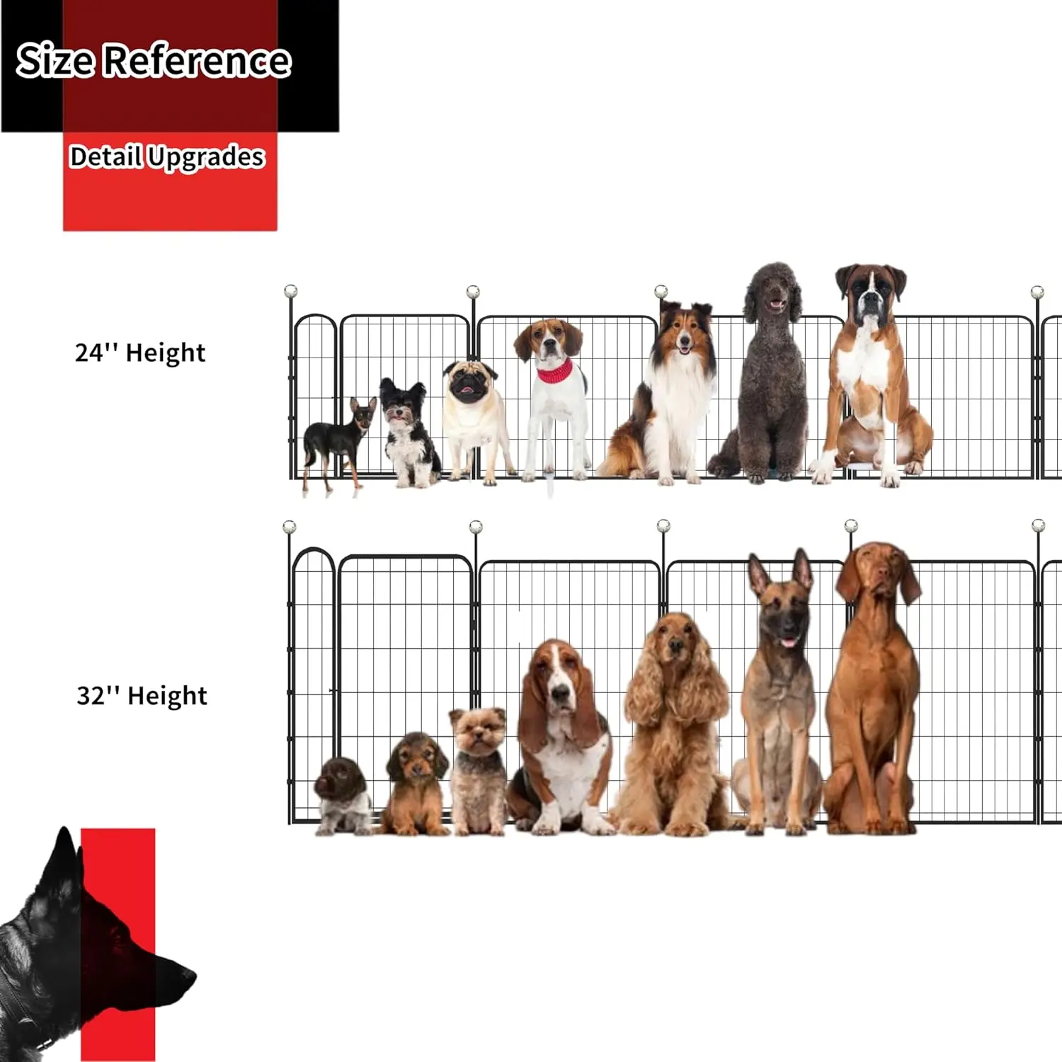 **Versatile Indoor & Outdoor Dog Playpen** Transform your pet's living space with our premium 32-inch portable dog playpen. Designed for both indoor and outdoor use, this versatile enclosure provides a safe and secure environment for your furry family members. **Key Features:** • **Dual Door Design**: Features two convenient access points with widened gates for easy entry and exit. The stainless steel locking mechanism ensures secure closure while allowing smooth operation. • **Rust-Resistant Construction**: Built with high-quality metal materials featuring electrostatic coating technology that prevents rust and corrosion. Perfect for outdoor use in yards, camping trips, RV adventures, and various weather conditions. • **Floor Protection System**: Each panel includes protective floor guards that prevent scratches and noise on indoor surfaces. Use confidently on hardwood floors, tiles, or carpets without worrying about damage. • **Quick Assembly**: No tools required! The automatic gravity-actioned locking system allows setup within minutes. Simply connect the 12 panels using sturdy stakes to create your desired enclosure shape - square, rectangle, or custom configurations. • **Portable Design**: Includes easy-carry straps for convenient transportation and storage. The collapsible design makes it ideal for travel, vet visits, or temporary containment needs. • **Safe Wire Spacing**: 1.57-inch wire spacing ensures optimal safety for medium to large breed dogs while maintaining good visibility and ventilation. **Perfect For:** - Home use as a designated play area - Outdoor activities including camping and backyard fun - Training sessions and behavior management - Temporary containment during gatherings or events - Travel accommodations in RVs or vacation rentals The durable construction supports active pets while the thoughtful design prioritizes both pet safety and owner convenience. Create a comfortable space where your dog can enjoy freedom while staying protected from potential hazards. **Specifications:** - Dimensions: 32 inches height - Material: Rustproof metal with protective coating - Panel Count: 12 interconnected panels - Included: Two access doors with secure locks - Weight Capacity: Suitable for medium to large breed dogs