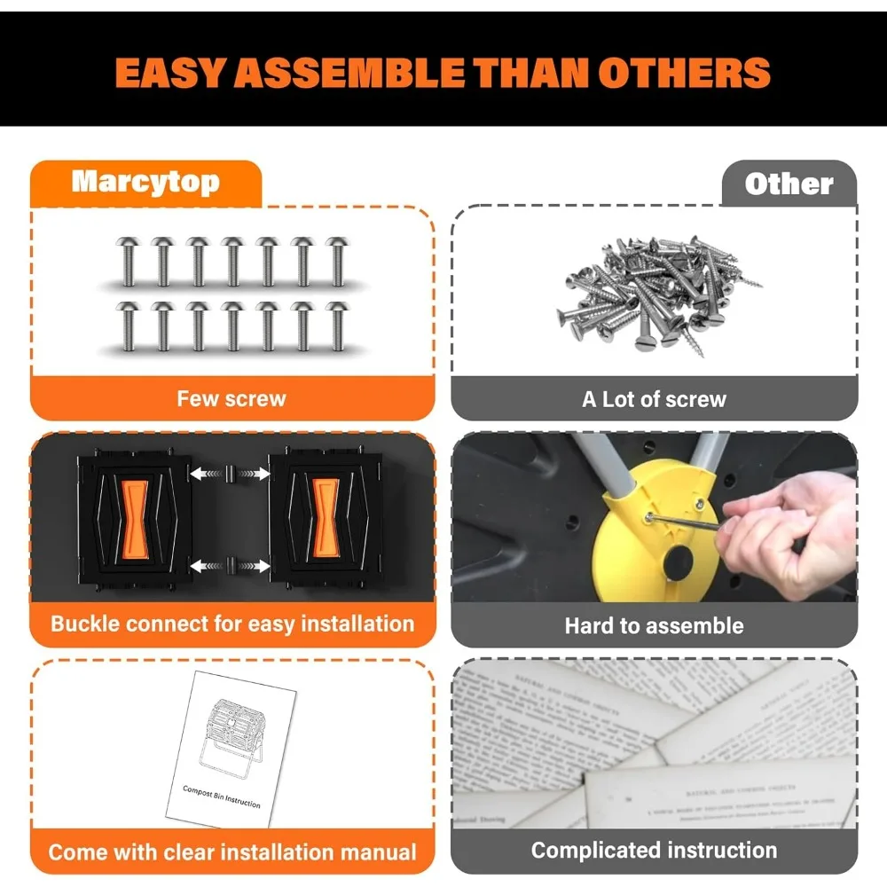 SPECIFICATIONSBrand Name: XMSJColor: As shown in the figureHigh-concerned chemical: NoneInstallation Method: AssemblyOrigin: US(Origin) Product Dimensions 29.5L x 26.7W x 37.5H Material Polypropylene Color Orange Capacity 45 Gallons Shape Hexagonal Item Weight 30.2 Pounds Manufacturer Marcytop This compost tumbler is designed with two separate 22.5-gallon chambers, allowing you to compost efficiently by starting a new batch while the...