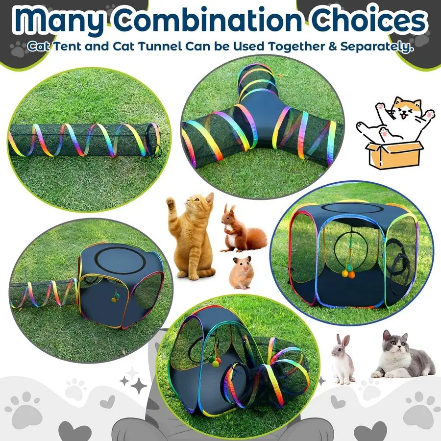 Outdoor Rainbow Cat Enclosure, 7 in 1 Portable Cat Tents for Outside Cage Free Outside Pet Enclosure Cat Tunnel Outdoor Playgrou